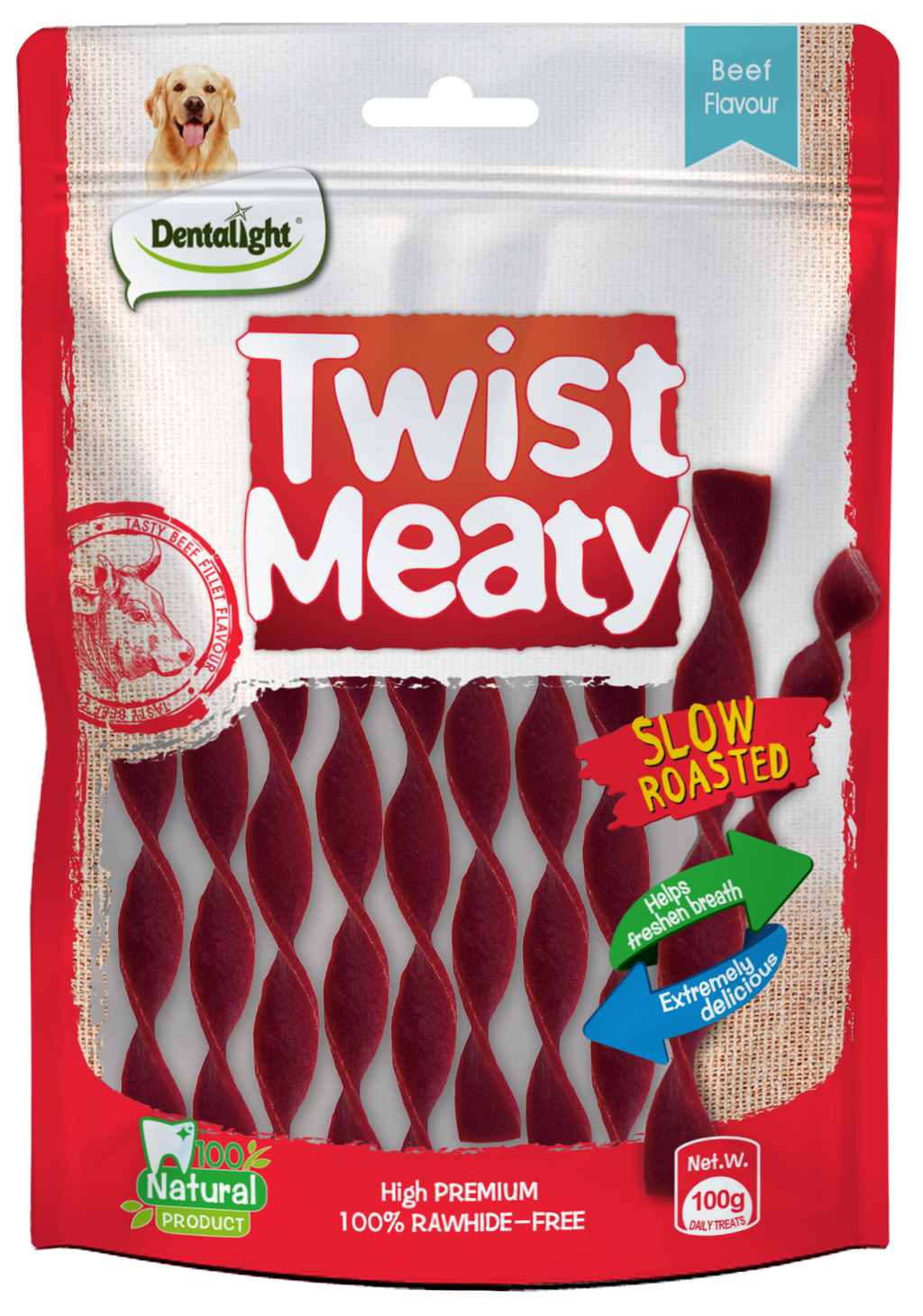 Our irresistible Meaty Twists are slow roasted with real meat and tasty with tasty Beef Fillet flavored strips. With blended parsley and Prebiotics help promote fresh breath and and digestive system.
