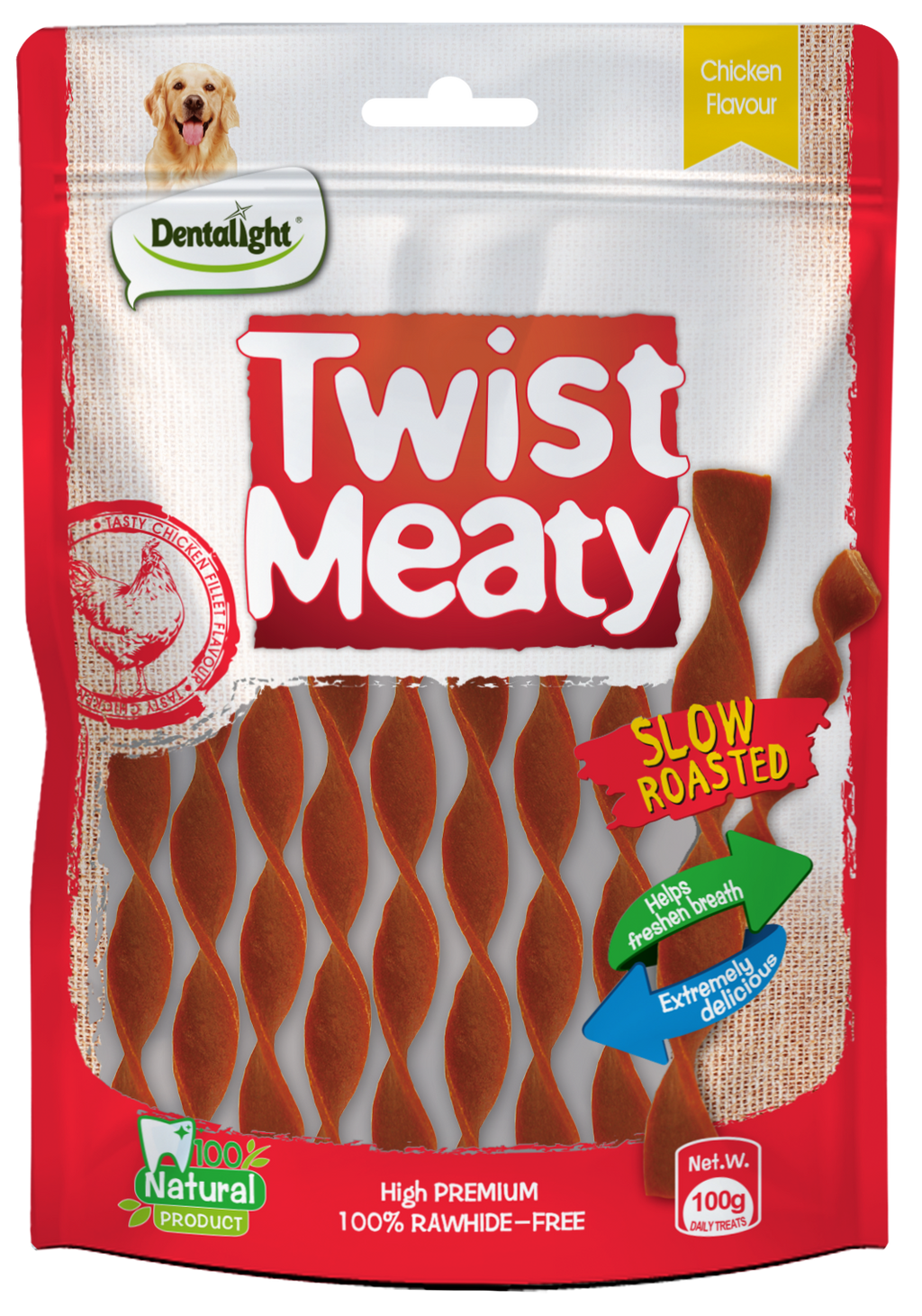 Our irresistible Meaty Twists are slow roasted with real meat and tasty with tasty Chicken Fillet flavored strips. With blended parsley and Prebiotics help promote fresh breath and and digestive system.